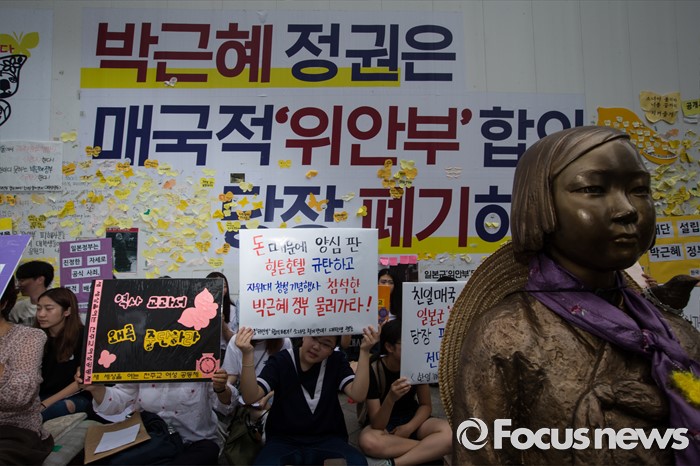 (서울=포커스뉴스) 자위대 창설 62주년 기념행사가 서울 한복판에서 열리고 하루가 지난 13일 오후, 서울 종로구 주한일본대사관 앞에서 일본군 '위안부' 문제 해결을 위한 제1239차 정기 수요집회가 열리고 있다.