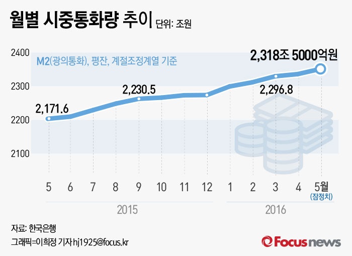 (서울=포커스뉴스) 13일 한국은행이 공개한 '2016년 5월중 통화 및 유동성' 자료에 따르면 지난 5월 M2(계절조정치·평잔)는 2318조5000억원으로 전년 동월 대비 6.7% 늘었다.