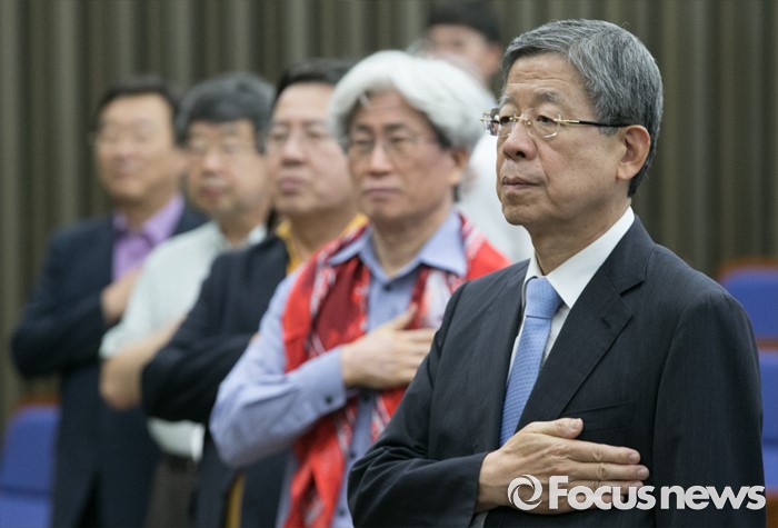 (서울=포커스뉴스) 13일 오후 서울 여의도 국회에서 열린 포용적 시장경제와 새누리당의 진로 토크 콘서트에 참석한 김희옥 혁신비대위원장 등 참석자들이 국기에 대한 경례를 하고 있다.