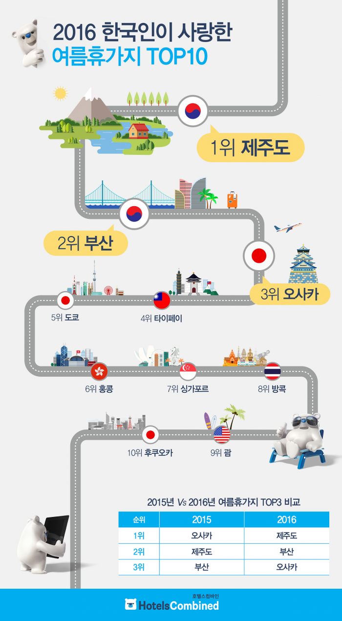 호텔스컴바인은 13일 호텔스컴바인 코리아 홈페이지를 통해 누적된 여름휴가 예약 데이터 20만 건을 분석한 결과 가장 많은 예약률을 보인 도시 1위는 제주였으며 부산과 일본 오사카가 그 뒤를 이었다고 밝혔다.