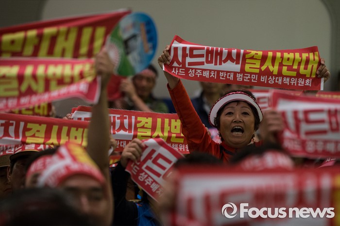 (서울=포커스뉴스) 국방부가 사드 배치 지역을 경북 성주로 확정지은 13일 오후 서울 용산구 국방컨벤션을 찾은 김항곤 군수와 군민들이 국방부를 상대로 항의하고 있다.