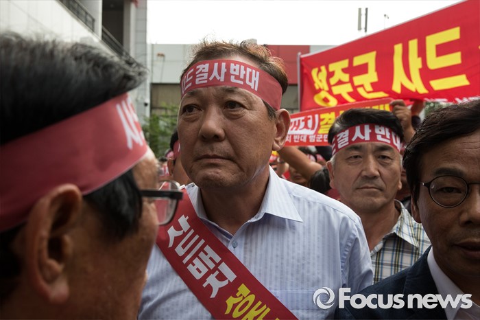 (서울=포커스뉴스) 국방부가 사드 배치 지역을 경북 성주로 확정지은 13일 오후 서울 용산구 국방컨벤션을 찾은 김항곤(가운데) 군수와 군민들이 국방부를 상대로 항의하기 위해 안으로 들어서고 있다.