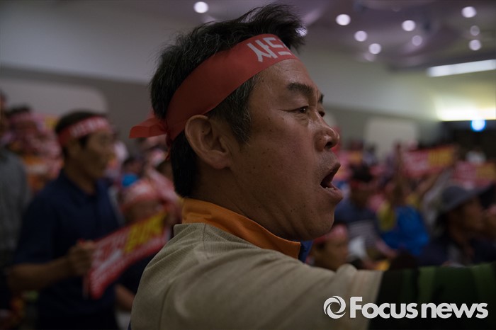 (서울=포커스뉴스) 국방부가 사드 배치 지역을 경북 성주로 확정지은 13일 오후 서울 용산구 국방컨벤션을 찾은 김항곤 군수와 군민들이 국방부를 상대로 항의하고 있다.