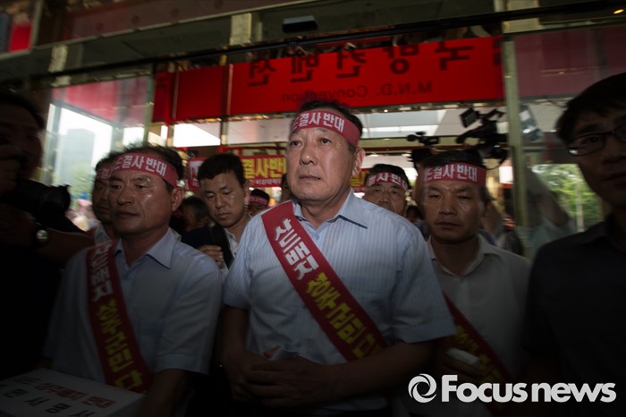 (서울=포커스뉴스) 13일 오후 서울 용산구 국방부를 찾은 성주 군수와 군민들이 사드배치 반대 성명서를 전달하기 위해 국방컨벤션을 들어서고 있다. 이날 국방부에서 주한미군 고고도 미사일 방어 체계 사드(THAAD) 배치 지역을 성주로 결정하고 공식 발표했다.