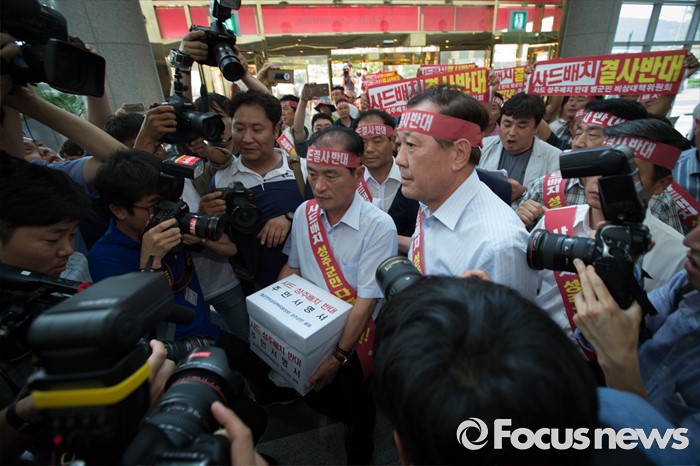 (서울=포커스뉴스) 13일 오후 서울 용산구 국방부를 찾은 성주 군수와 군민들이 사드배치 반대 성명서를 전달하기 위해 국방컨벤션을 들어서고 있다. 이날 국방부에서 주한미군 고고도 미사일 방어 체계 사드(THAAD) 배치 지역을 성주로 결정하고 공식 발표했다.