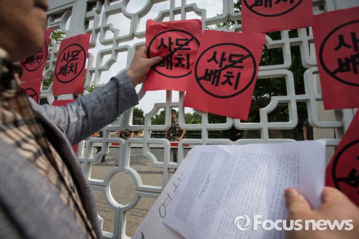 (서울=포커스뉴스) 13일 오후 평통사(평화와 통일을 여는 사람들) 관계자 및 시민들이 서울 용산구 국방부 앞에서 성주 사드 배치 반대 시위를 하고 있다. 이날 국방부는 주한미군 고고도 미사일 방어 체계 사드(THAAD) 배치 지역을 성주로 결정, 발표 했다.