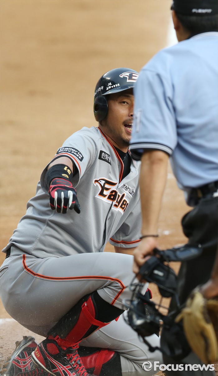 (서울=포커스뉴스) 13일 서울 잠실구장에서 열린 2016 프로야구 한화-LG 경기 1회초 2사 2,3루에서 중견수 앞 3루타를 친 한화 김경언이 홈까지 뛰어 슬라이딩한후 이민호 주심을 바라보고 있다.