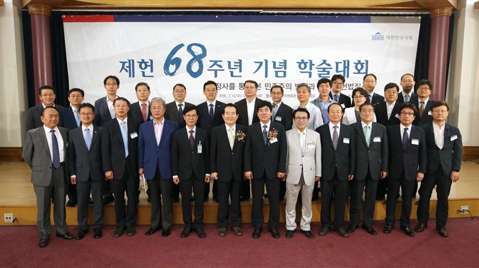 (서울=포커스뉴스) 정세균 국회의장이 13일 오후 서울 여의도 국회 의원회관에서 열린 '제헌 68주년 기념 학술대회'에 참석해 내빈들과 기념촬영을 하고 있다. <사진제공=국회>