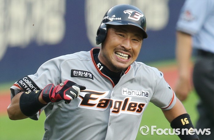 (서울=포커스뉴스) 13일 서울 잠실구장에서 열린 2016 프로야구 한화-LG 경기 1회초 2사 2,3루에서 한화 김경언이 중견수앞 3루타를 치고 3루를 지나 홈으로 온 힘을 다 해 달리고 있다.