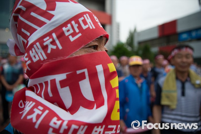 (서울=포커스뉴스) 13일 오후 서울 용산구 국방컨벤션을 찾은 군민들이 사드배치 반대 집회를 하고 있다.이날 국방부에서 주한미군 고고도 미사일 방어 체계 사드(THAAD) 배치 지역을 성주로 결정하고 공식 발표했다.