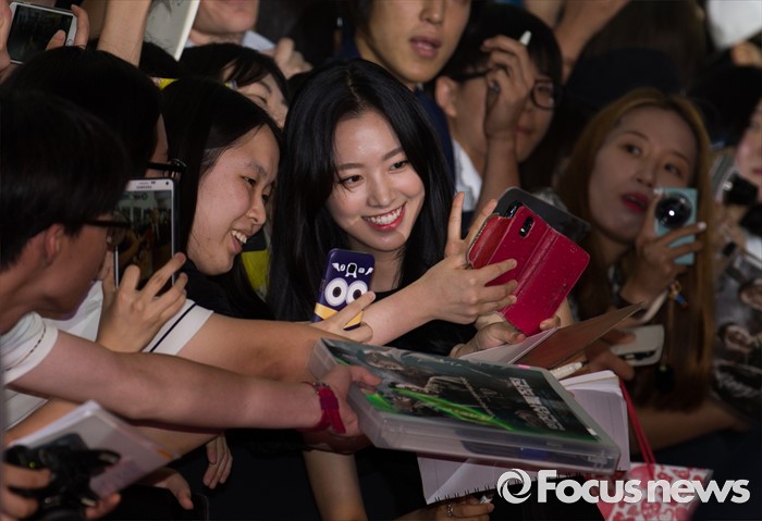 (서울=포커스뉴스) 13일 오후 서울 영등포구 타임스퀘어에서 열린 영화 '인천상륙작전' 레드카펫 행사에 참석한 배우 진세연이 팬들과 사진 찍고 있다.