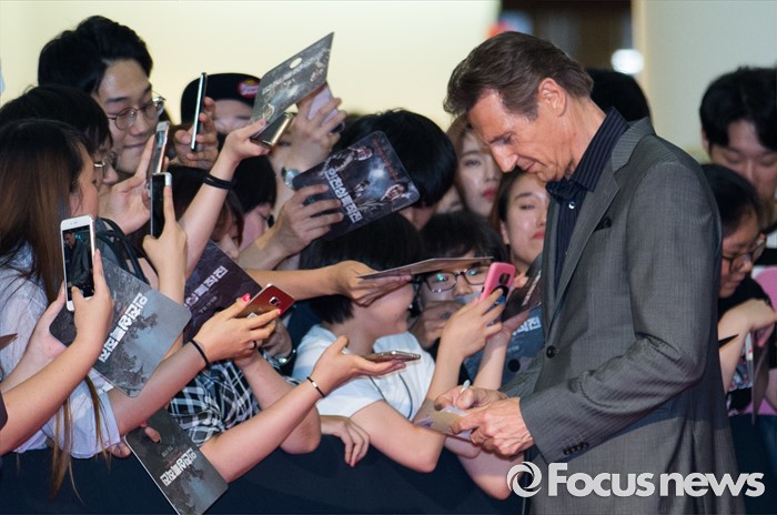 (서울=포커스뉴스) 13일 오후 서울 영등포구 타임스퀘어에서 열린 영화 '인천상륙작전' 레드카펫 행사에 참석한 배우 리암 리슨이 팬들에게 사인 하고 있다.