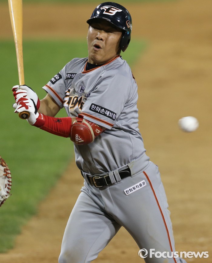| △ 위협구에 몸 피하는 한화 정근우 |