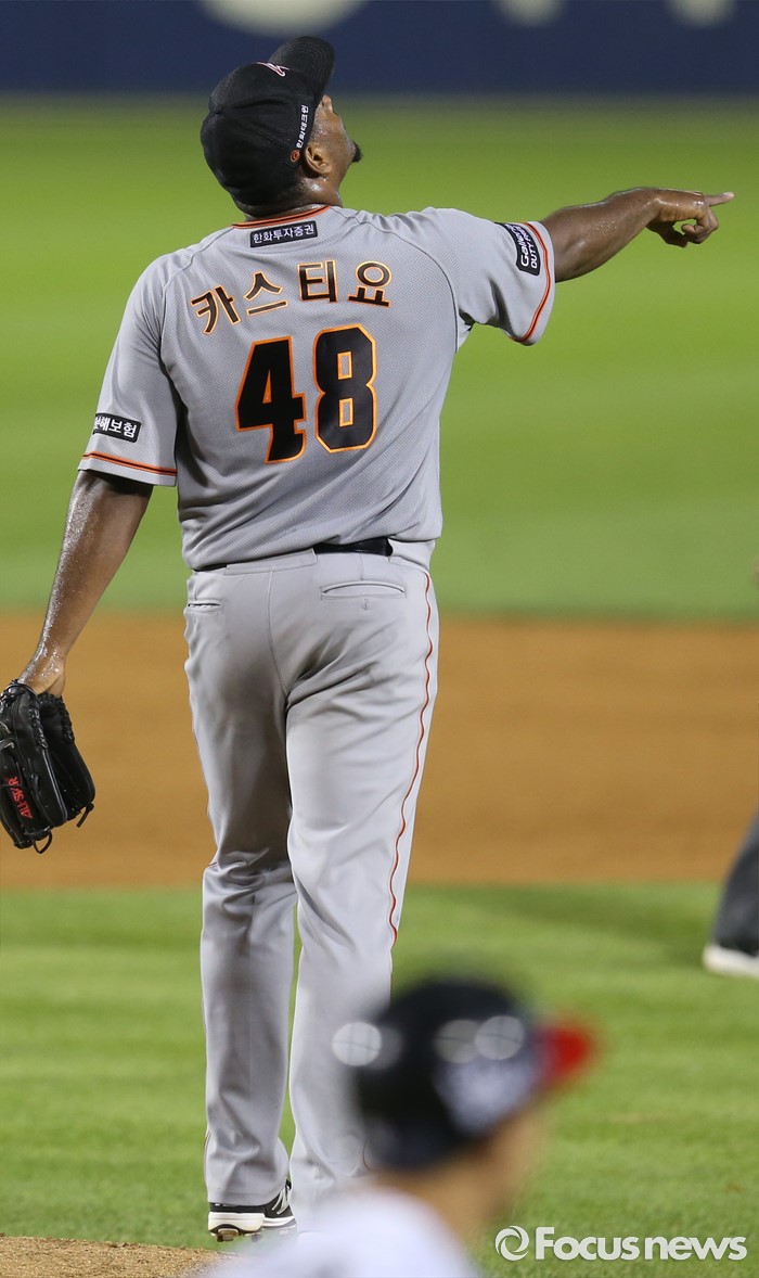 (서울=포커스뉴스) 13일 서울 잠실구장에서 열린 2016 프로야구 한화-LG 경기 9회말 한화 투수 카스티요가 LG 정성훈의 뜬공을 가리키고 있다.