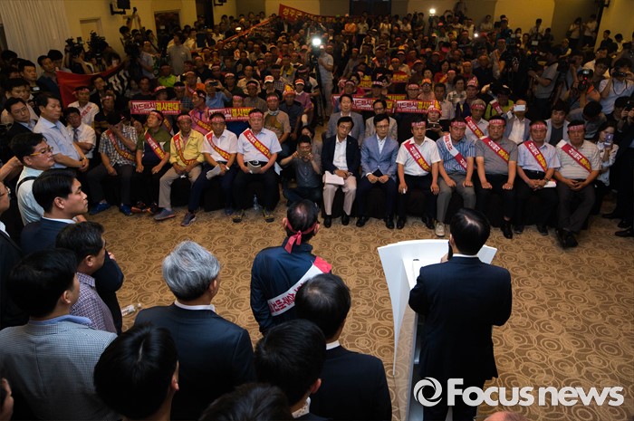 (서울=포커스뉴스) 한민구(오른쪽 첫번째) 국방부 장관이 13일 오후 서울 용산구 국방컨벤션센터에서 사드 배치에 항의 방문 중인 김항곤 성주군수 등 사회단체장 및 군민들에게 사과 발언을 하고 있다. 국방부는 이날 경북 성주군을 고고도 미사일 방어(사드·THAAD)체계 배치 지역이라고 공식 발표했다.