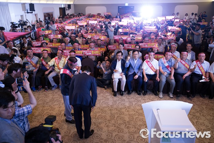 (서울=포커스뉴스) 한민구 국방부 장관이 13일 오후 서울 용산구 국방컨벤션센터에서 사드 배치에 항의 방문 중인 김항곤 성주군수 등 사회단체장 및 군민들에게 사과 인사를 하고 있다. 국방부는 이날 경북 성주군을 고고도 미사일 방어(사드·THAAD)체계 배치 지역이라고 공식 발표했다.