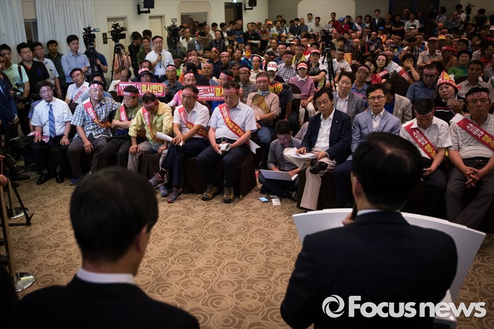 (서울=포커스뉴스) 한민구(오른쪽 첫번째) 국방부 장관이 13일 오후 서울 용산구 국방컨벤션센터에서 사드 배치에 항의 방문 중인 김항곤 성주군수 등 사회단체장 및 군민들과 대화하고 있다. 국방부는 이날 경북 성주군을 고고도 미사일 방어(사드·THAAD)체계 배치 지역이라고 공식 발표했다.