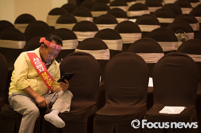 (서울=포커스뉴스) 13일 오후 서울 용산구 국방컨벤션센터에서 성주 사드 배치 문제로 항의 방문 중인 한 성주 군민이 동료들이 밖으로 나간 후 홀로 핸드폰을 만지며 자리를 지키고 있다. 국방부는 이날 경북 성주군을 고고도 미사일 방어(사드·THAAD)체계 배치 지역이라고 공식 발표했다.