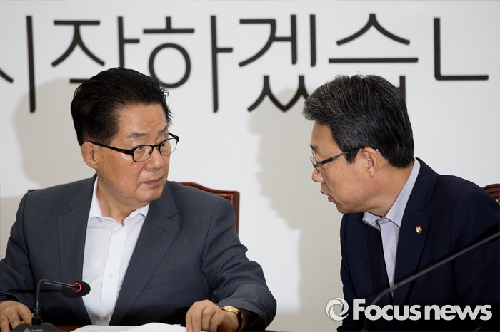 (서울=포커스뉴스) 박지원(왼쪽) 국민의당 비상대책위원장과 김성식 정책위의장이 14일 오전 서울 여의도 국회에서 열린 원내정책회의에 참석해 대화 하고 있다.