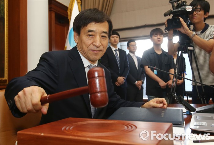 지난 13일 한국은행이 공개한 '2016년 6월 중 금융시장 동향'을 보면 올 6월 은행 가계대출은 667조5000억원으로 전월 대비 6조6000억원 늘었다. 지난해 6월 증가폭(8조1000억원)과 비교하면 다소 둔화됐지만 2010~2014년 6월 평균 증가액 3조원보다는 2배가 넘는다.(서울=포커스뉴스) 14일 오전 서울 중구 한국은행에서 열린 제14차 금융통화위원회의에 참석한 이주열 한국은행 총재가 개회를 알리는 의사봉을 두드리고 있다. 2016.07.14 양지웅 기자