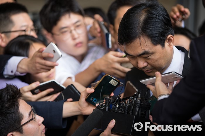 (서울=포커스뉴스) '주식 대박' 논란에 휩싸인 진경준 검사장이 14일 오전 서울 서초구 서울중앙지방검찰청으로 출석해 취재진의 질문을 받고 있다.