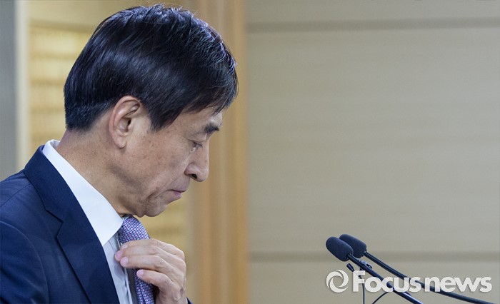 (서울=포커스뉴스) 이주열 한국은행 총재가 14일 오전 서울 중구 한국은행에서 통화정책방향에 대해 설명하기 전 넥타이를 고쳐 메고 있다. 한은은 이날 열린 제14차 금융통화위원회의를 통해 기준금리를 현 수준(1.25%)으로 동결했다.