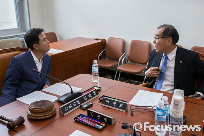 (서울=포커스뉴스) 국회 농해수위 세월호 소위 위원장인 김태흠(왼쪽) 새누리당 의원과 국회 농해수위 세월호 소위 더불어민주당 간사 이개호 의원이 14일 오전 서울 여의도 국회에서 열린 농림축산식품해양수산위원회 세월호 소위에 참석해 대화 하고 있다.