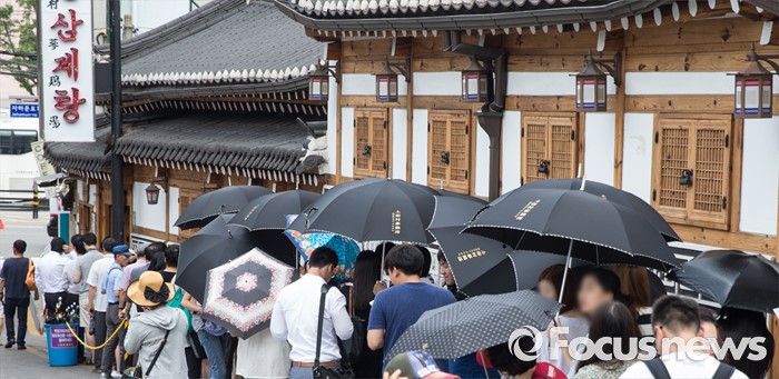 (서울=포커스뉴스) 초복을 사흘 앞둔 14일 오후 서울 종로구에 위치한 한 삼계탕 전문식당을 찾은 시민들이 줄을 서고 있다.