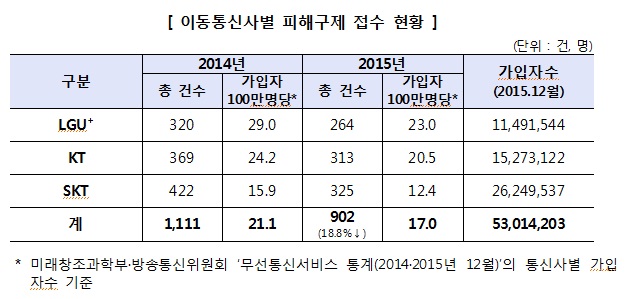 14일 한국소비자원에 따르면 지난해 이통사에 대한 피해구제 접수 건수는 총 902건으로, 2014년 대비 18.8% 감소했다.