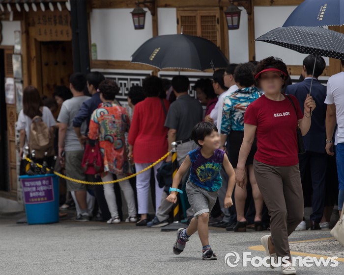 (서울=포커스뉴스) 초복을 사흘 앞둔 14일 오후 서울 종로구에 위치한 한 삼계탕 전문식당앞 한 어린이가 뛰어가고 있다.