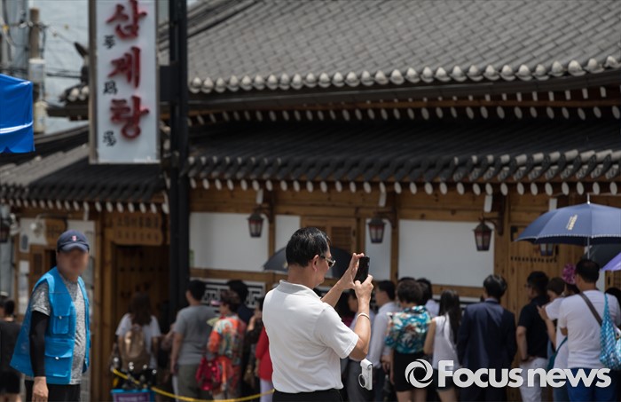 (서울=포커스뉴스) 초복을 사흘 앞둔 14일 오후 서울 종로구에 위치한 한 삼계탕 전문식당을 찾은 한 시민이 사진을 찍고 있다.