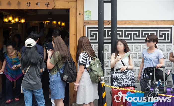 (서울=포커스뉴스) 초복을 사흘 앞둔 14일 오후 서울 종로구에 위치한 한 삼계탕 전문식당을 찾은 시민들이 줄을 서고 있다.