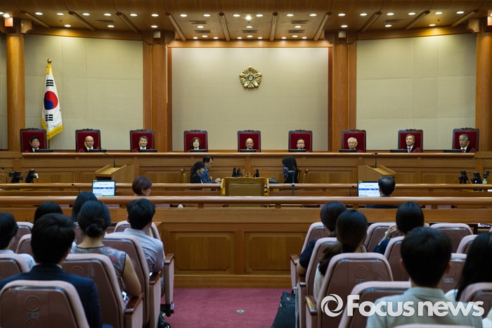 (서울=포커스뉴스) 14일 오후 서울 종로구 헌법재판소 대심판정에서 박한철(가운데) 헌법재판소장이 비례대표 국회의원 후보 공개연설 금지 공개 변론를 위해 자리에 착석해 있다.