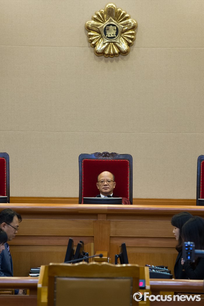 (서울=포커스뉴스) 14일 오후 서울 종로구 헌법재판소 대심판정에서 박한철 헌법재판소장이 비례대표 국회의원 후보 공개연설 금지 공개 변론를 위해 자리에 착석해 있다.