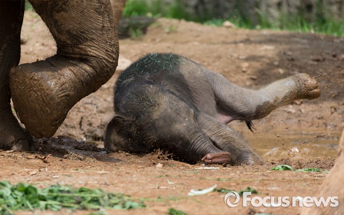 (과천=포커스뉴스) 14일 오후 경기도 과천 서울대공원에서 지난달 24일에 태어난 새끼 아시아 코끼리(암컷)가 야외 방사장을 뛰놀다 넘어지고 있다. 이 아기코끼리는 '멸종위기에 처한 야생 동식물의 국제 거래에 관한 협약(CITES)' 1급 보호종으로 지정된 아시아코끼리다.