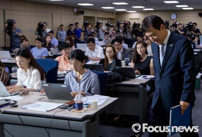 (서울=포커스뉴스) 이주열 한국은행 총재가 14일 오후 서울 중구 한국은행에서 최근의 물가안정목표제 운영상황에 대해 설명하기 위해 발걸음을 옮기고 있다.