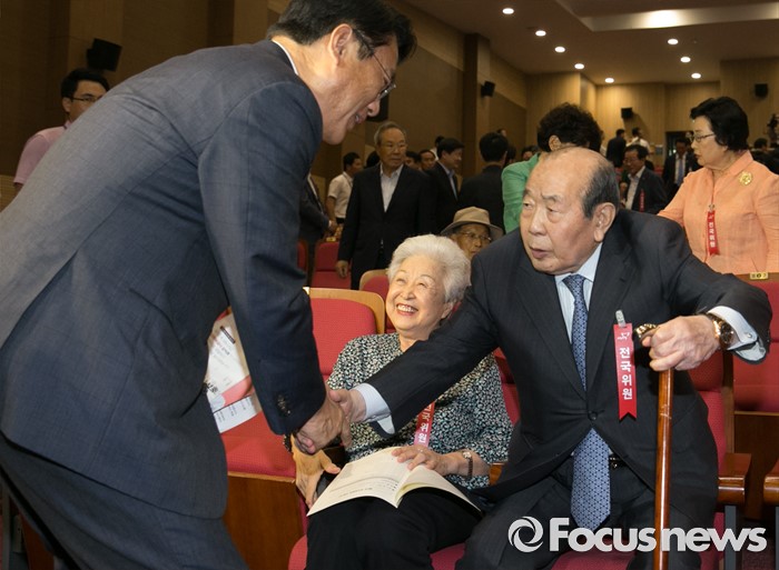 (서울=포커스뉴스) 14일 오후 서울 여의도 국회 의원회관에서 열린 새누리당 전국위원회에 참석한 김수한(오른쪽) 상임고문과 정진석 원내대표가 인사하고 있다.