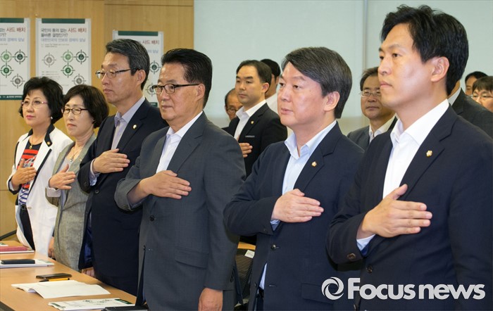 (서울=포커스뉴스) 14일 오후 서울 여의도 국회 의원회관에서 국민의당 주최로 열린 '국민의 동의없는 사드 배치 올바른 결정인가' 토론회에 참석한 손금주(오른쪽부터) 대변인, 안철수 전 대표, 박지원 비대위원장, 김성식 정책위의장 등 참석자들이 국기에 대한 경례를 하고 있다.