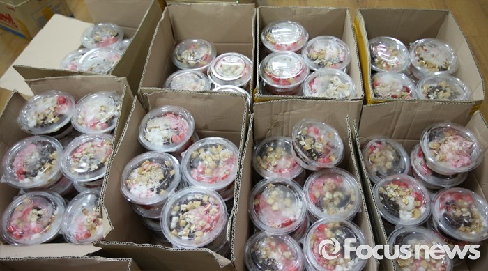 (대전=포커스뉴스) 초복을 사흘 앞둔 14일 오후 대전 유성구청에서 열린 팥빙수데이 행사에서 허태정 구청장과 직원들이 함께 만든 팥빙수가 각 동별로 구분되어 있다. 이번 팥빙수데이 행사에는 팥빙수 900인분을 만들어 구 산하 직원들에게 전달했다.