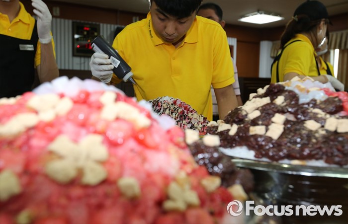 (대전=포커스뉴스) 초복을 사흘 앞둔 14일 오후 대전 유성구청에서 직원들에게 전달할 900인분의 팥빙수가 만들어 지고 있다.