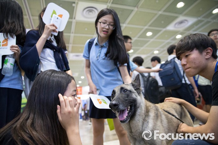 (서울=포커스뉴스) 14일 오후 서울 강남구 코엑스에서 열린 전문대학 엑스포에 참가한 학생들이 한 대학 애견학과에서 소개하는 강아지를 바라보고 있다.