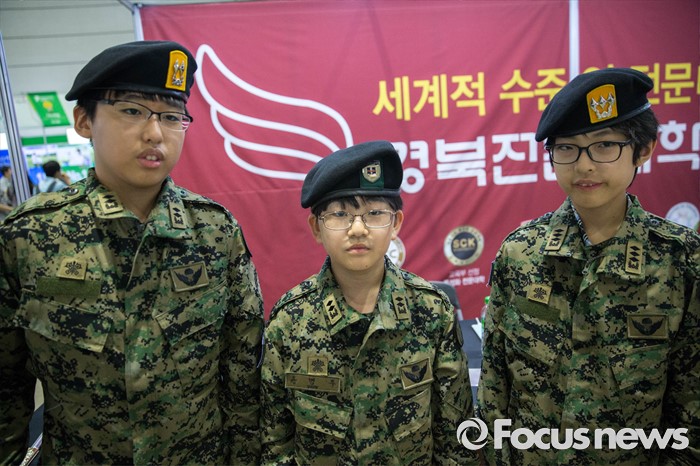 (서울=포커스뉴스) 14일 오후 서울 강남구 코엑스에서 열린 전문대학 엑스포에 참가한 학생들이 군복을 입는 체험을 하고 있다.
