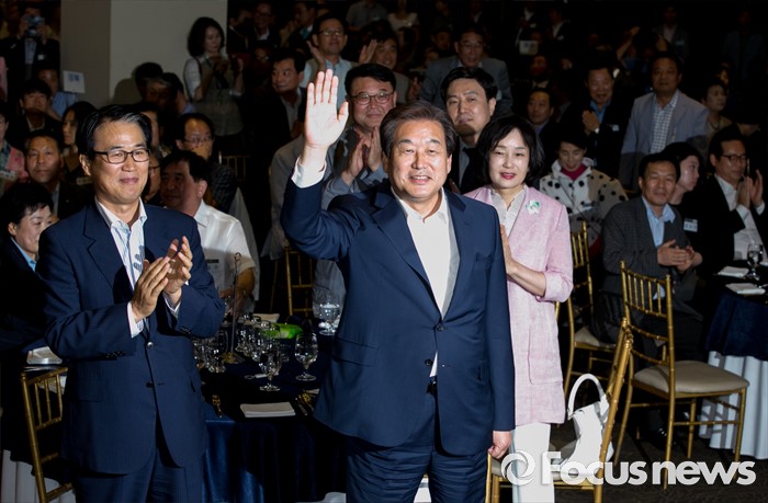 (서울=포커스뉴스) 14일 오후 서울 영등포구 그랜드컨벤션센터에서 열린 당대표 취임 2주년 행사에 참석한 김무성 새누리당 전 대표가 손을 들어 인사하고 있다.