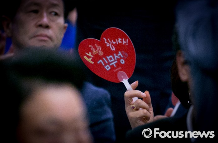 (서울=포커스뉴스) 14일 오후 서울 영등포구 그랜드컨벤션센터에서 열린 김무성 새누리당 전 대표 취임 2주년 행사에 참석한 한 지지자가 김 전 대표를 지지하는 문구가 적힌 부채를 흔들고 있다.