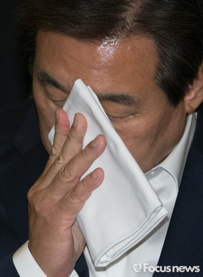 (서울=포커스뉴스) 14일 오후 서울 영등포구 그랜드컨벤션센터에서 열린 당대표 취임 2주년 행사에 참석한 김무성 새누리당 전 대표가 얼굴을 닦고 있다.