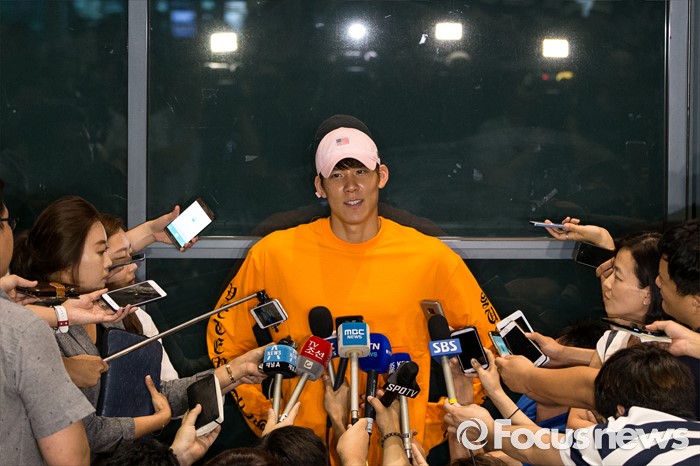(인천공항=포커스뉴스) 리우 올림픽 출전이 확정된 '마린보이' 박태환이 호주 전지훈련을 마치고 14일 오후 인천국제공항을 통해 입국해 기자회견을 하고 있다.