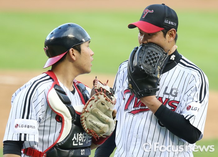 (서울=포커스뉴스) 14일 서울 잠실구장에서 열린 2016 프로야구 한화-LG 경기에서 LG 투수 류제국이 1회초 수비를 마치고 덕아웃으로 들어가며 포수 유강남과 자신의 투구에 관해 얘기하고 있다.