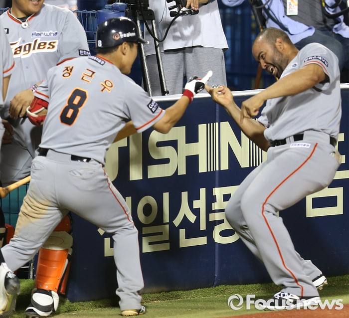 (서울=포커스뉴스) 14일 서울 잠실구장에서 열린 2016 프로야구 한화-LG 경기 6회말 2사후 한화 정근우가 좌월 솔로 홈런을 치고 덕아웃에서 로사리오와 손가락 마주치기를 하고 있다.