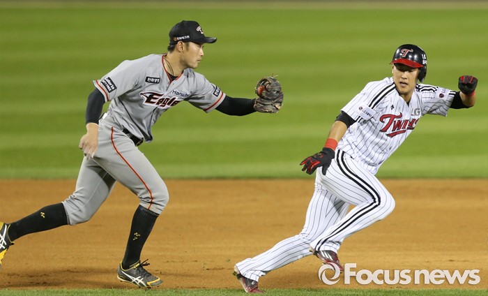(서울=포커스뉴스) 14일 서울 잠실구장에서 열린 2016 프로야구 한화-LG 경기 5회말 무사 1,2루에서 LG 박용택의 우중간 안타로 2루주자가 홈인하는 사이 1루주자 이천웅이 3루까지 뛰려다 런다운에 걸려 한화 3루수 송광민에게 쫓기고 있다.