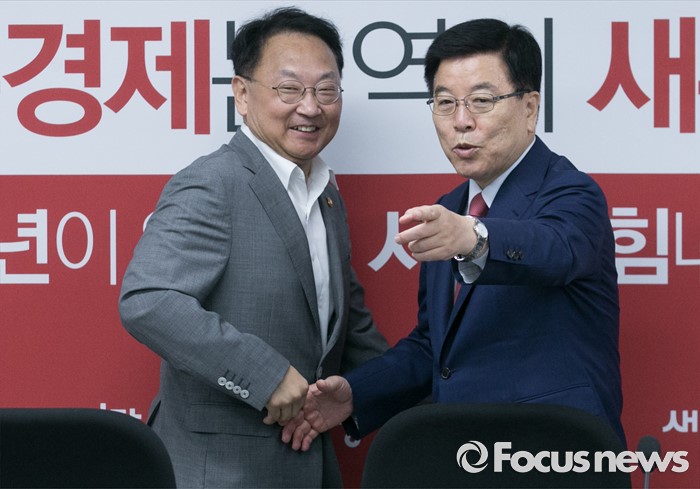 (서울=포커스뉴스) 15일 오전 서울 여의도 국회에서 열린 2016년도 추가경정예산 당정협의에 참석한 김광림(오른쪽) 새누리당 정책위의장과 유일호 경제부총리 겸 기획재정부 장관이 인사하고 있다.